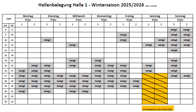 Bei Problemen können Sie sich an unseren Hallenwart Jürgen Derus Tel. Nr. 01629265382 wenden.